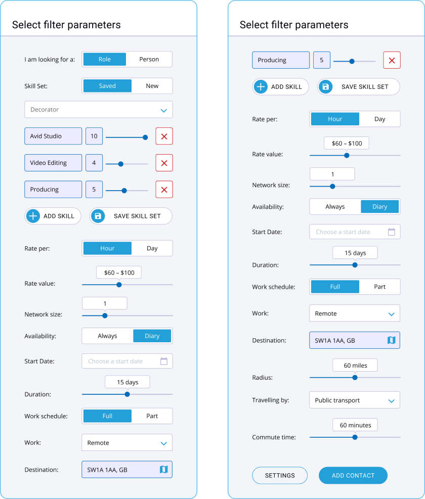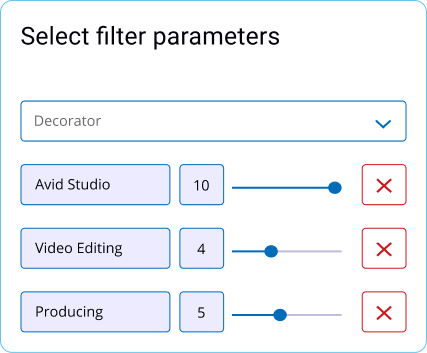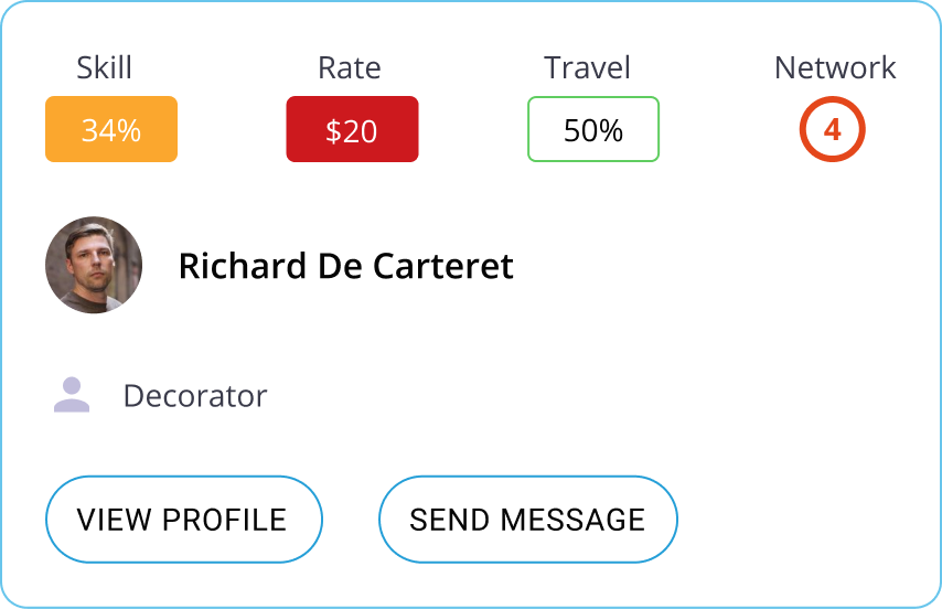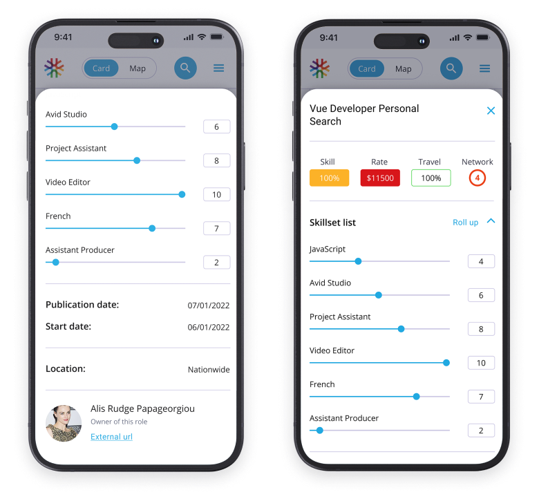 Например, вам нужен человек, который умеет программировать на Java. Вы указываете конкретные скилы и ожидаемый уровень кандидата в панели поиска и система анализирует навыки и роли ваших знакомых и их друзей. Затем она предлагает список подходящих людей, указывая процент их соответствия исходному запросу. Если вы ищете работу, через цепочки знакомых можно найти подходящую вакансию.