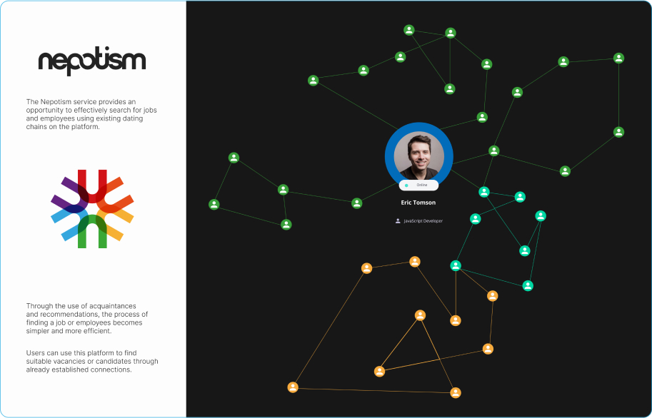 Nepotism — это сервис, который помогает найти работу или сотрудников через цепочки знакомств на платформе.