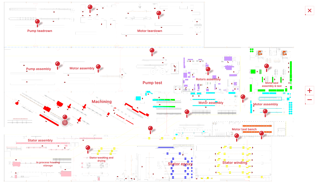 Для удобства перемещения в приложение была добавлена интерактивная карта. На ней пользователь может видеть своё положение, названия участков и объектов в цехе, а также перемещаться к выбранному объекту по клику.