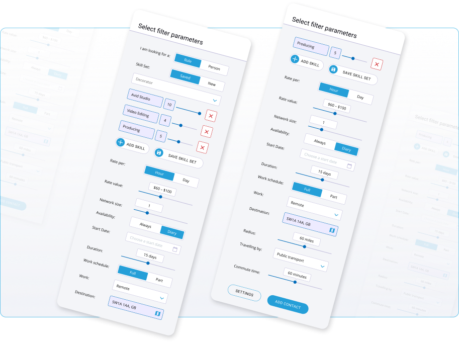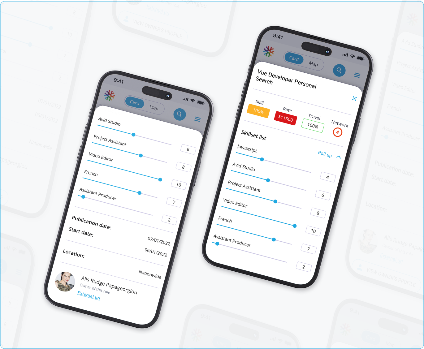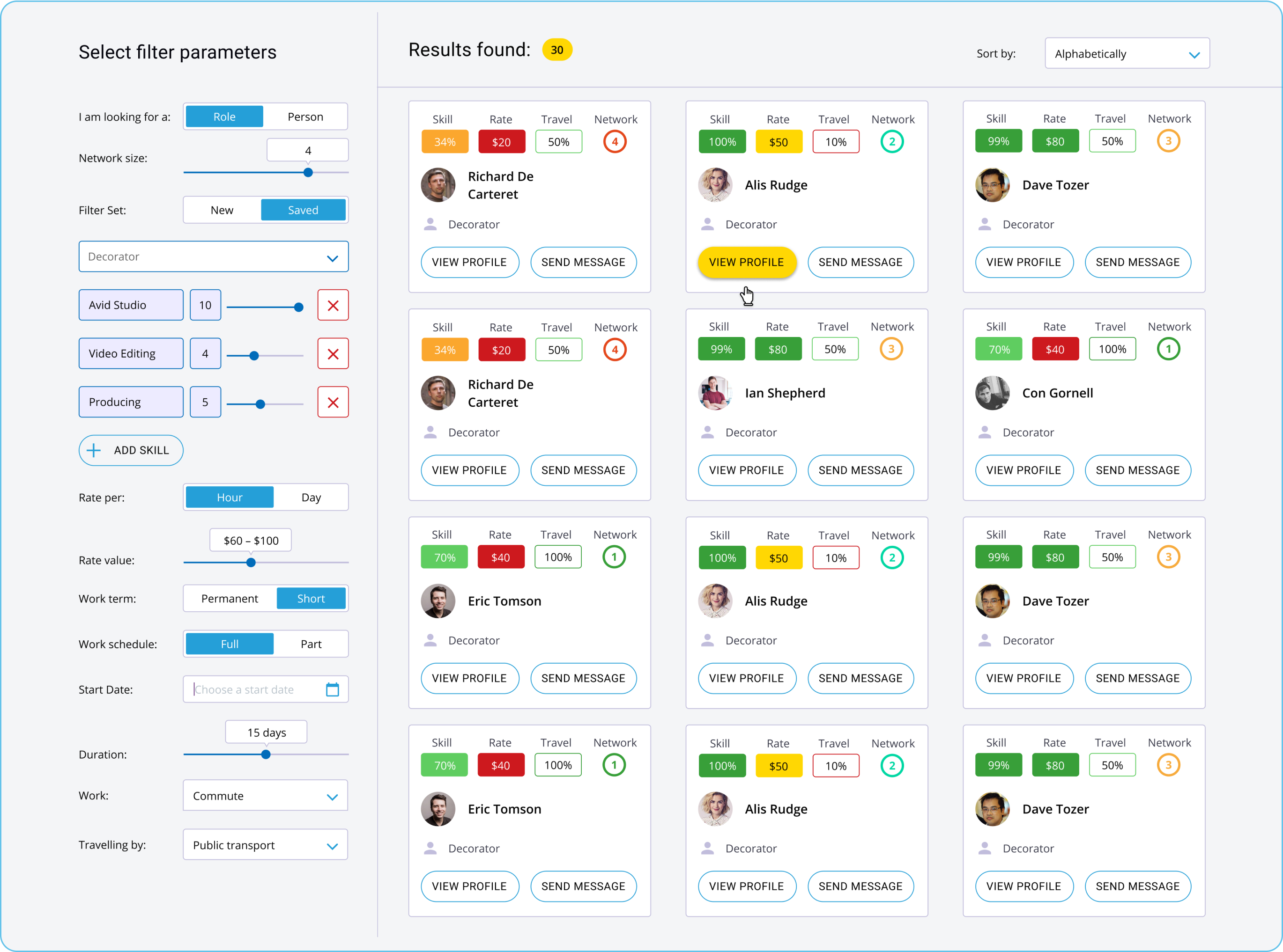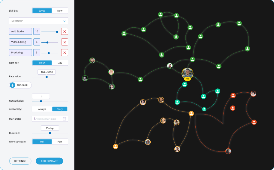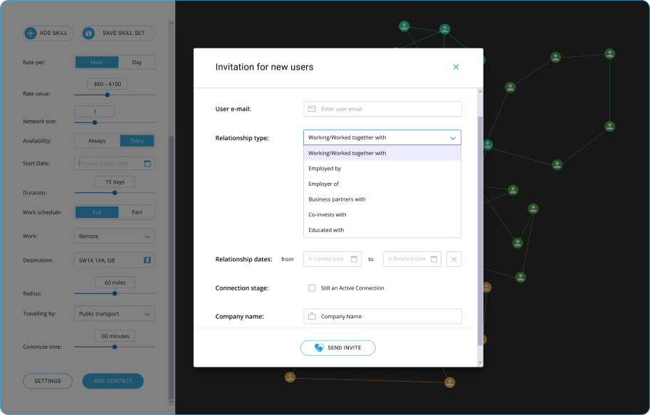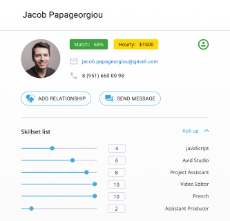 Например, вам нужен человек, который умеет программировать на Java. Вы указываете конкретные скилы и ожидаемый уровень кандидата в панели поиска и система анализирует навыки и роли ваших знакомых и их друзей. Затем она предлагает список подходящих людей, указывая процент их соответствия исходному запросу. Если вы ищете работу, через цепочки знакомых можно найти подходящую вакансию.